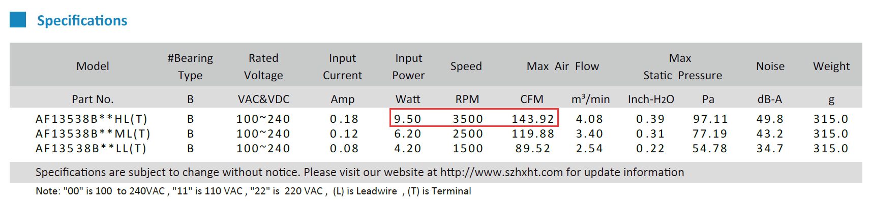 AF/EC13538散熱風(fēng)扇達(dá)到3500RPM的時(shí)候,風(fēng)量為143.92CFM,而功率為9.5W。